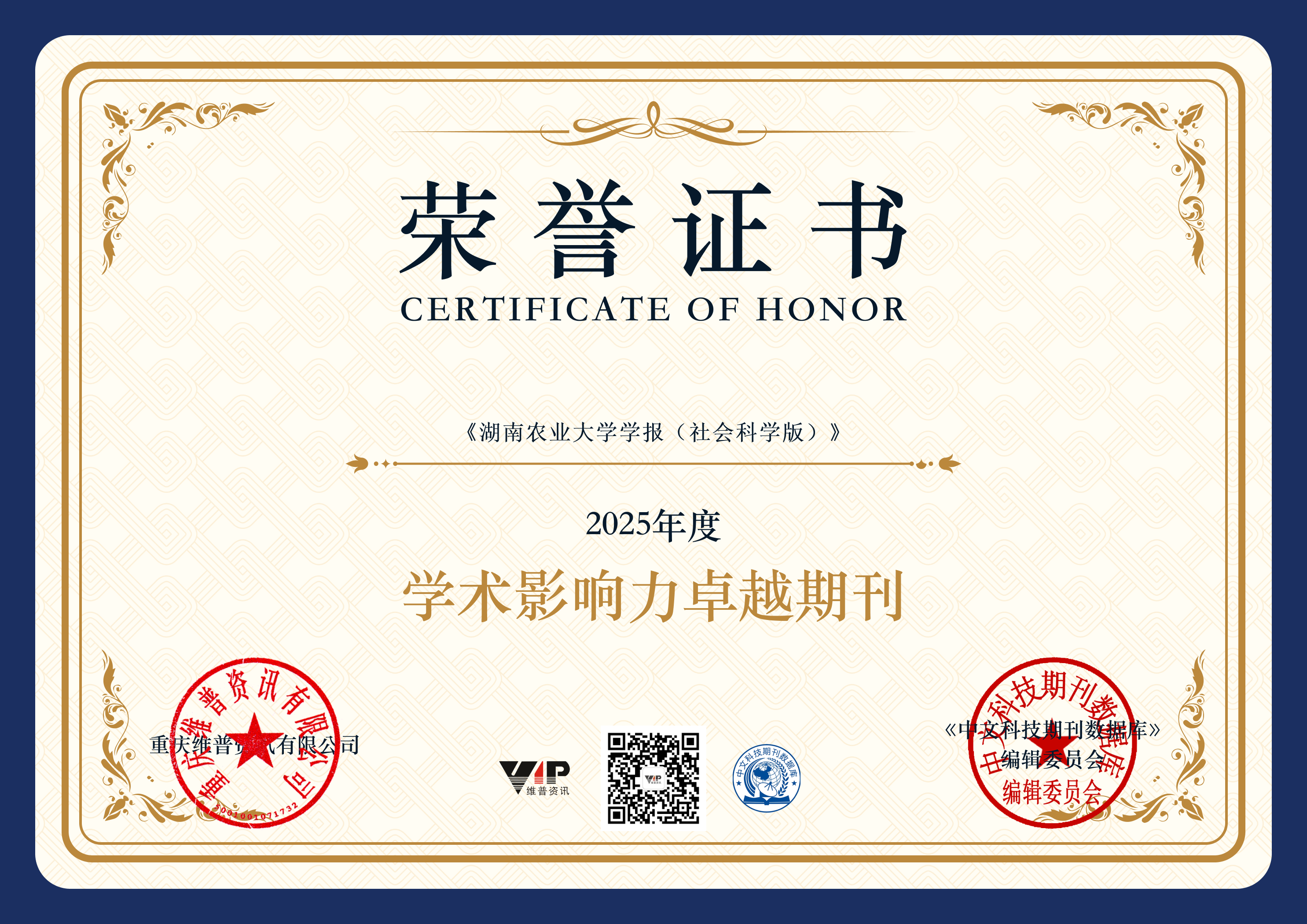 《湖南农业大学学报(社会科学版)》 荣获“2025年度学术影响力卓越期刊”